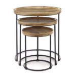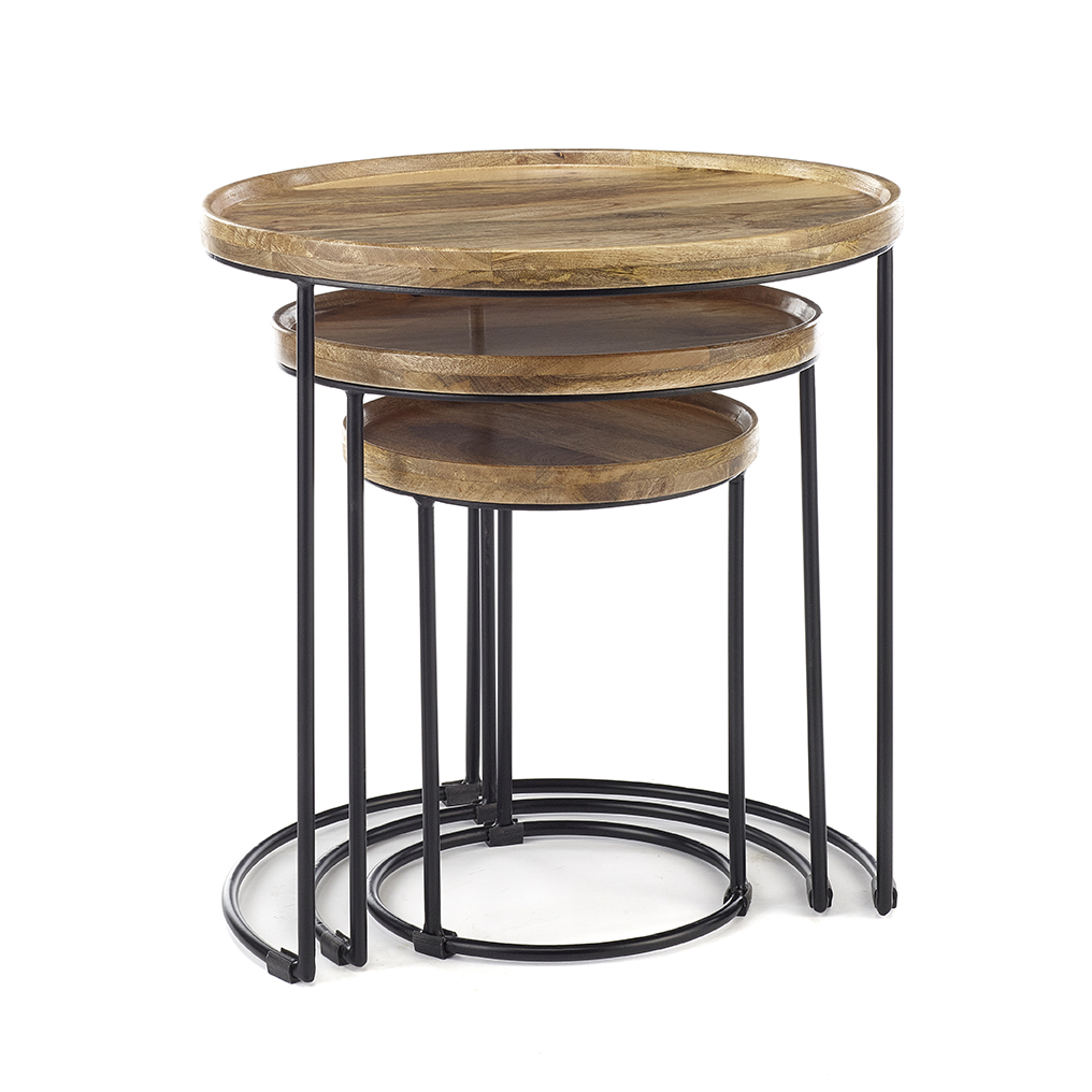 Round nest of three tables with a solid Mango wood top finished in light oak and metal powder coated black base.