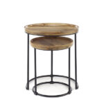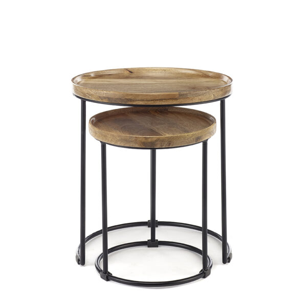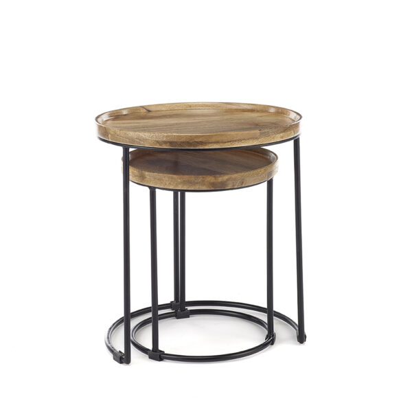 Round nest of two tables with a solid Mango wood top finished in light oak and metal powder coated black base.
